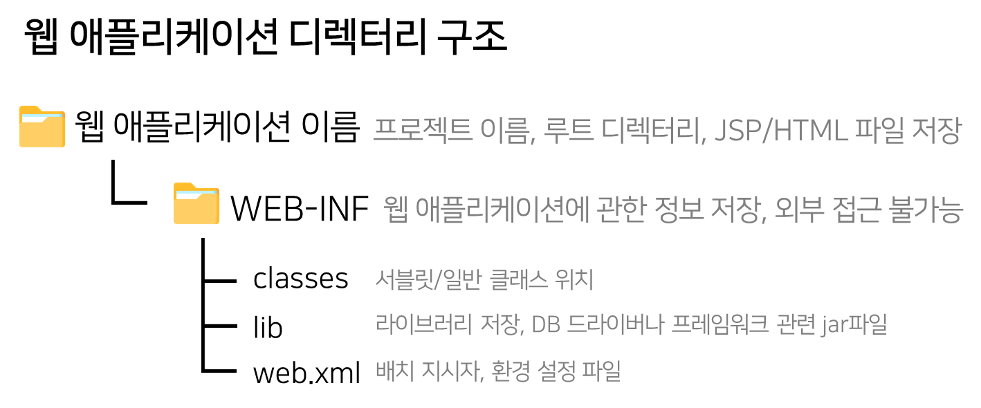 - 톰캣과 같은 웹 컨테이너에서 실행하는 웹 애플리케이션은 일정한 디렉터리 구조를 갖추고 있다.